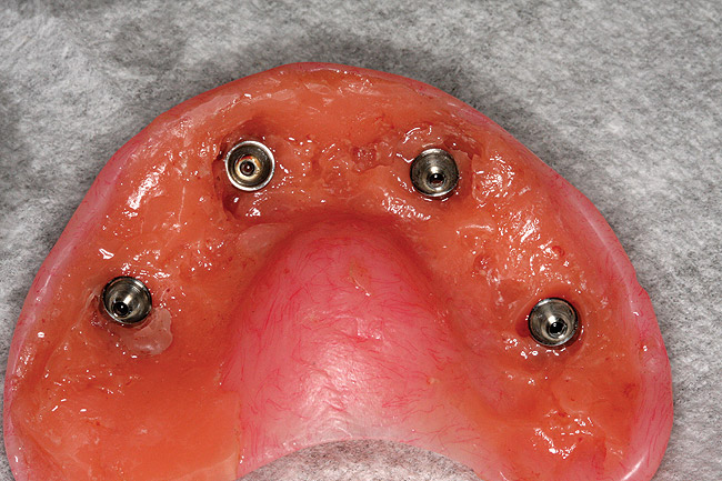 Using a stock tray, holes were drilled so that the 20-mm guide pins could pass through the tray, and an open-tray impression of the prosthesis could be taken using PVS material such as Flexitime® (Kulzer), Aquasil Ultra (DENTSPLY Caulk, www.caulk.com), or Hongium® (DMG America, www.dmg-america.com). The purpose of this impression was to record any discrepancies between the healed tissue and the provisional during the 3-month integration period. Once the impression was set, the guide pins were removed. The impression was then removed with the prosthesis still embedded. A plastic healing cap was placed on the multi-unit abutment while the provisional was out of the mouth for approximately 1 hour as the case was poured and mounted.