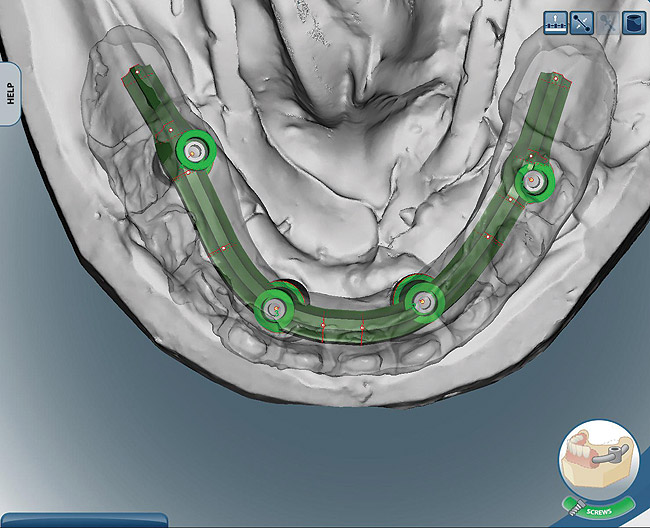 The laboratory technician made a small triad base-plate using at least two titanium provisional sleeves into the base plate. This allowed the restorative dentist to stabilize any required intermediate tooth try-ins. The teeth were set up, and a wax-up of the facial contours was produced. The facial and lingual contours of the wax-up were created as an exact replica of the finished product. The teeth were removed from the wax-up leaving a negative of the denture teeth in the wax around the arch. The master cast and baseplate without the teeth were forwarded to the bar manufacturer for scanning. Due to the fact that this particular technique and the implants can accommodate a wide range of prosthetics and abutments, high-strength zirconia or titanium substructures can be fabricated using CAD/CAM technology (Figure 8 and Figure 9).10,11 Therefore, the bar was designed on screen considering support for each tooth, and then it was milled and returned to the laboratory.