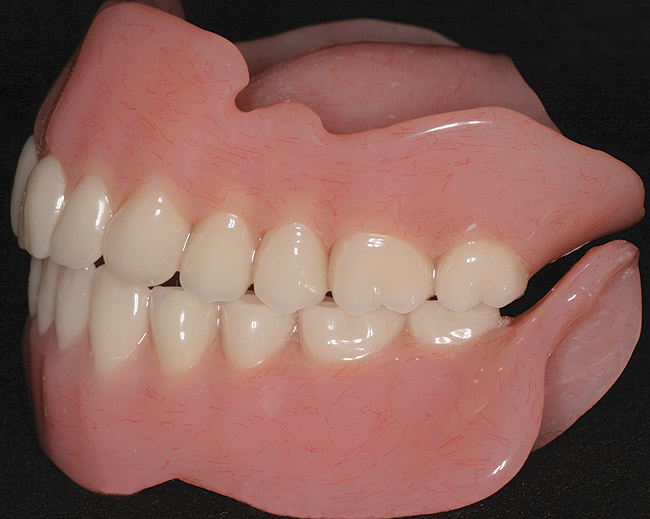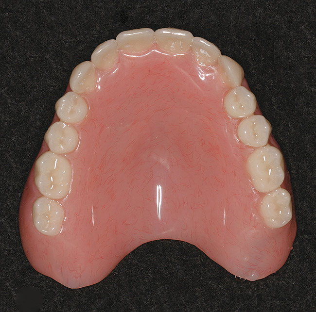 Along with advances in denture base materials and processing techniques, manufacturers continue to develop and introduce tooth lines with improved esthetics and mechanical properties.13 Some teeth lines are manufactured with a layering process that uses a triple-cross-linked PMMA resin and microfilled materials for improved wear resistance. Other manufacturers have introduced nano-hybrid composite technology into the tooth manufacturing process. These teeth will bond to PMMA base materials without any special bonding agent. Examples include the Phonares® tooth line (Ivoclar Vivadent Inc, www.ivoclarvivadent.us) and the Mondial® tooth line (Kulzer, www.kulzer.com).