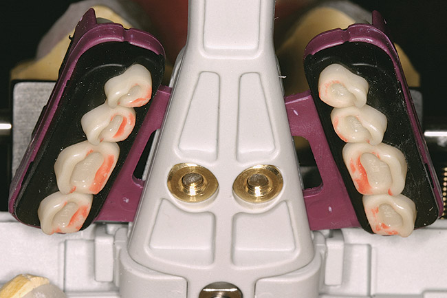 CAD/CAM techniques have provided significant benefits and improvements in fixed prosthodontics. However, up until recently, this has not been the case in the removable field. The most notable exception is the use of CAD/CAM design and manufacturing principles in the fabrication of posterior teeth. With this approach, teeth are produced with high levels of accuracy and uniformity, making it possible to produce precisely matched pairs of teeth. This has allowed Heraeus to develop and release a novel method of posterior tooth set-up that uses these CAD/CAM-generated teeth with a jig system and specially designed articulator—the Filou 28™ Denture set-up system (Figure 5 through Figure 8). The jig system allows for anatomically correct positioning of the posterior teeth relative to each other, using specially customized posterior tooth impression blocks. Advantages include standardization of posterior tooth set-ups, accurate occlusal arrangement, and time-savings in the set-up process.