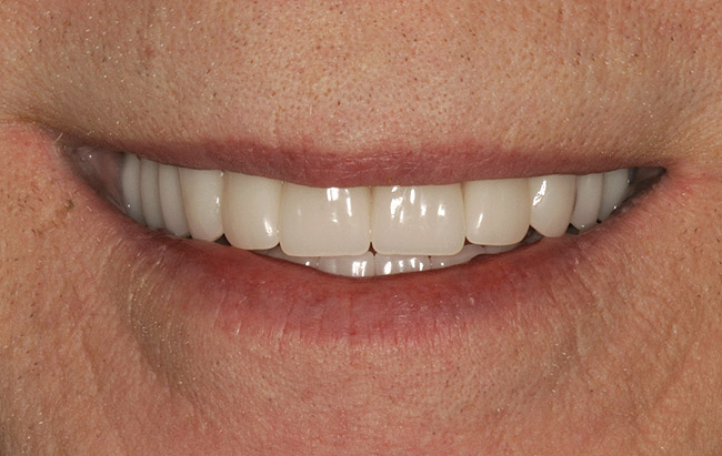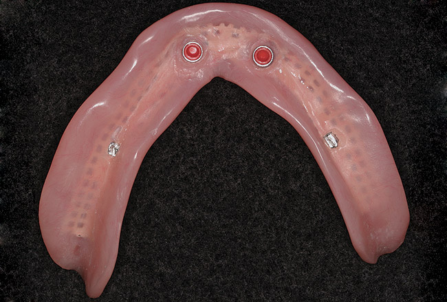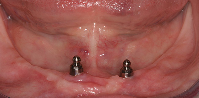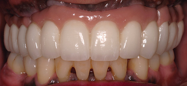 In overdenture therapy, prosthetic design can be divided into two groups: stress-broken and rigid. Stress-broken prostheses require fewer implants, with attention to biomechanical design features to allow for rotation (stress-breaking) of the prostheses around the implant locations. These prostheses are essentially tissue-supported and implant-retained. They replace the adhesive/glue, providing needed retention, comfort, and support. An example would include two implants in site Nos. 23 and 26, with either solitary anchor systems (ball or stud attachments) or a splinted bar-overdenture design (Figure 9 through Figure 11). Masticatory function is improved and patient satisfaction increased. Rigid prostheses require multiple implants, with the forces being transferred from the supra-infrastructure directly to the implants. These prostheses are implant-supported and implant-retained. The design can be removable or fixed (Figure 12 through Figure 16), depending on patient- and operator-mediated preferences.24-27 Within the fixed group of prostheses, materials used may vary from acrylic-fused-to-metal, porcelain-fused-to-metal, or all-ceramic. The cost of these material choices varies significantly, with acrylic options providing the most affordable, entry-level approach for the patient.14